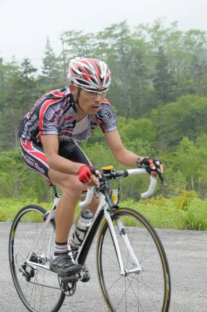 TTスタート地点を過ぎてスキー場の林の中に入ってしばらくすると、後ろから愛三の選手が抜かしていった。スタート直後の600Wを見送って走っていたのか?