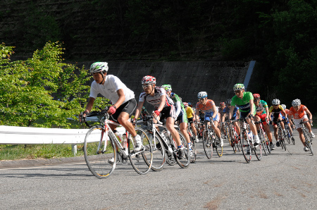 3周目以降はきっちり3人だけがポイントを争っていた。その後6週目までは時々下がって休んだり前でローテーションしたり。そして6週目だったか、ダムを過ぎて作戦通りにみんなで前を固めてじわじわ上げて最後の坂でリーさんを発射。私はついて行かず(行けず?)、後ろの押さえに回りました。少し間は開きましたが集団は必死で追いかけて逃げは吸収されました。残念!