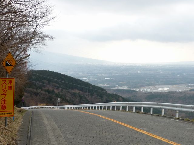 登った後は激坂の下り。18%の看板が見えます。ここより少し下にも18%の看板があって、その他10%以上の看板がゴロゴロしています。下に見えるのは富士SWだったか。エンジン音がうるさかった。